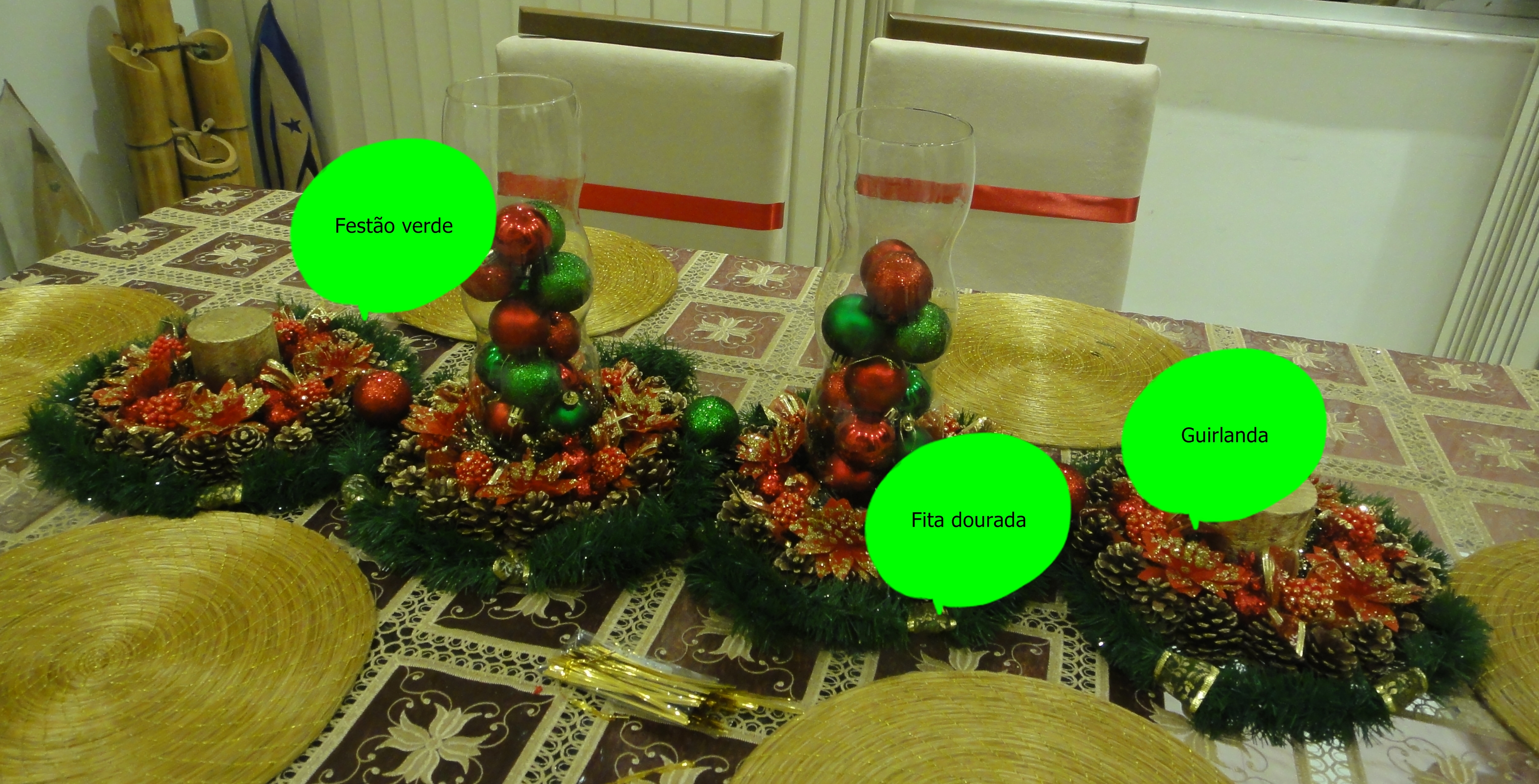 As guirlandas que eu comprei, no Saara, eram douradas e achei que seria necessário algo verde para destacar o arranjo em relação a toalha da mesa. Envolvi as guirlandas com festão verde e prendi com fitas douradas.