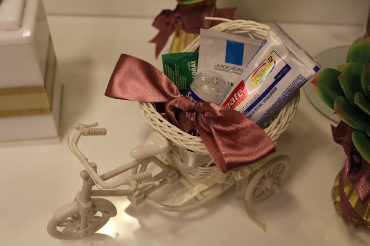 Uma dica muito legal é sempre organizar uma caixinha com pasta de dente líquida,  fio dental, anti-ácido e outras coisinhas que você ache interessante. Faça tudo de forma delicada, nada de jogar em cima da bancada hein!