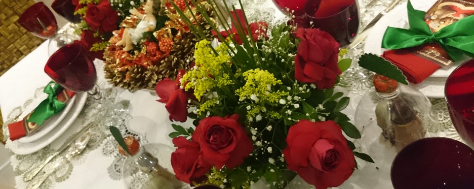 Quero dar um destaque aos arranjos. Os dois de rosas vermelhas comprei prontos, estavam bonitos, mas pelo preço esperava que fossem mais resistentes. O do centro eu mesma fiz. Usei bolas de Natal, uma guirlanda e um menino Jesus. Gosto de trazer o menino Jesus para a mesa, para que todos possam se lembrar do porquê de estar ali.