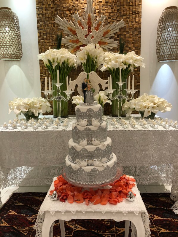 Escolhemos o branco e o prata como cores. Também apostei nas pérolas e velas. Dessa vez ao invés de usar velas pequenas em copinhos, apostei na imponência dos candelabros.